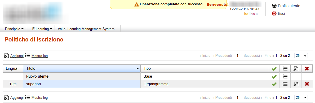 In gestione della politica appena creata aggiungo organigramma > [Scuola] Stud_superiori > Si ...e tutto procede senza intoppi. Aggiungo i corsi (già attivi e frequentati) e confermo: anche qui tutto bene. Infine poi metto i flag a ciascun corso e quando salvo finalmente le modifiche, compare il messaggio "Operazione completata con successo" ma a fianco all'icona che segnala che qualcosa non va: