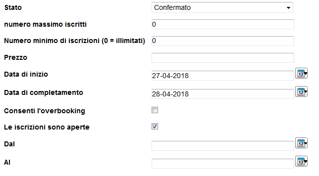 - Creo un nuovo corso Elearning a edizioni, stato confermato, iscrizioni aperte - solo admin dal 1/4/2018 al 30/4/2018: noto che dopo aver salvato le modifiche ed essere tornato nel corso per modificare queste due date non compaiono