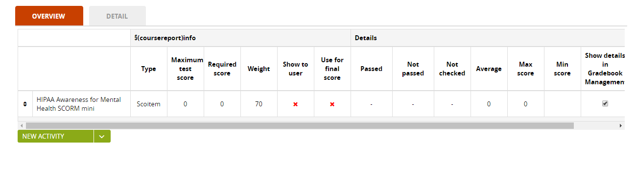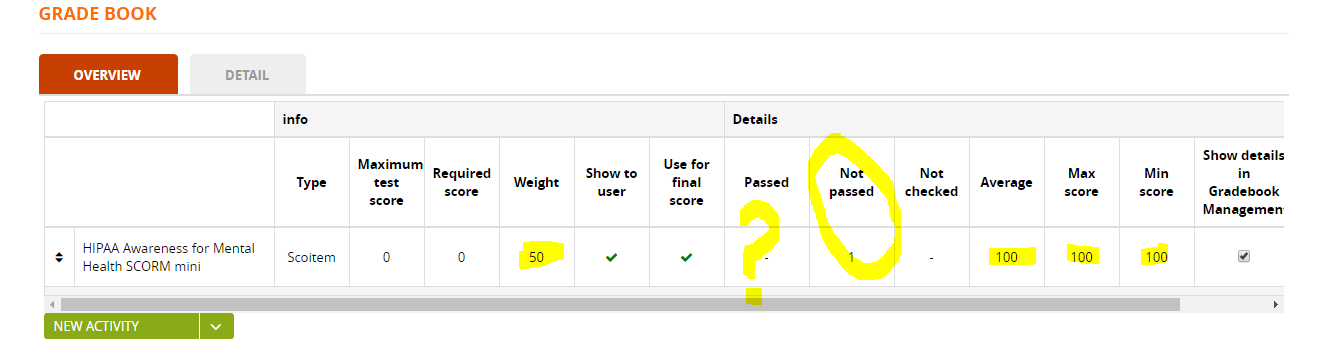 As I said, the "Overview" tab displays the aggregated number of users who passed. You can see the specific users in the "Detail" tab. So if your user has passed, you will see 1 in the overview.haseeb wrote: ↑Wed Oct 31, 2018 5:59 pm My scorm course pass cmi.core.lesson_status = completed do I need to pass cmi.core.lesson_status = passed as well? because after adding scorm activity in GradeBook I am still seeing not passed.