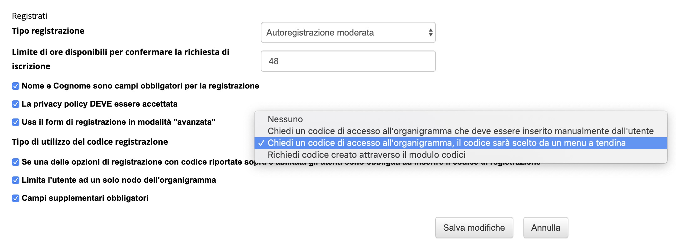 Nella piattaforma ho vari nodi, nelle impostazioni utilizzo "Tipo di utilizzo del codice registrazione" e nel menu a discesa selezione "Chiedi un codice di accesso all'organigramma, il codice sara scelto dal menu a tendina".