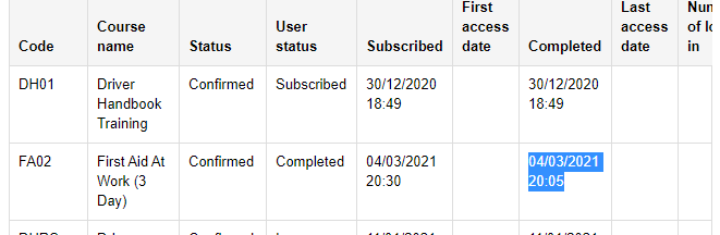 The date of completion in the user panel is being displayed incorrectly. So I'll start debugging this, as it should be drawing that value from learning_course_date_user (in the instance displayed the id_date is 494 and id_user is 15569
