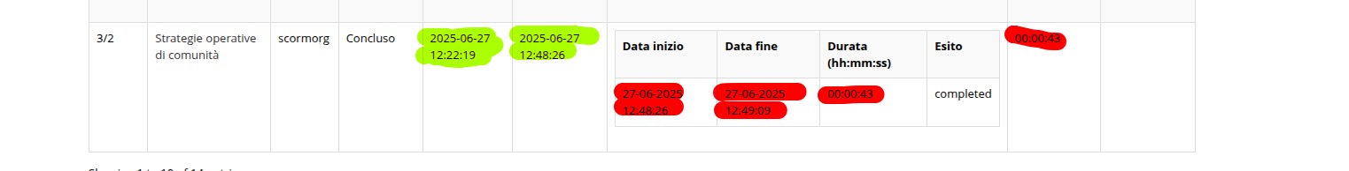 Il dato corretto è memorizzato SOLO in "learning_scorm_tracking_history" ma anche qui ci sono delle incongruenze a causa del session keeping. Insomma dal sistema non escono dati reali ma "manipolati" dal sistema stesso oppure incongrui.