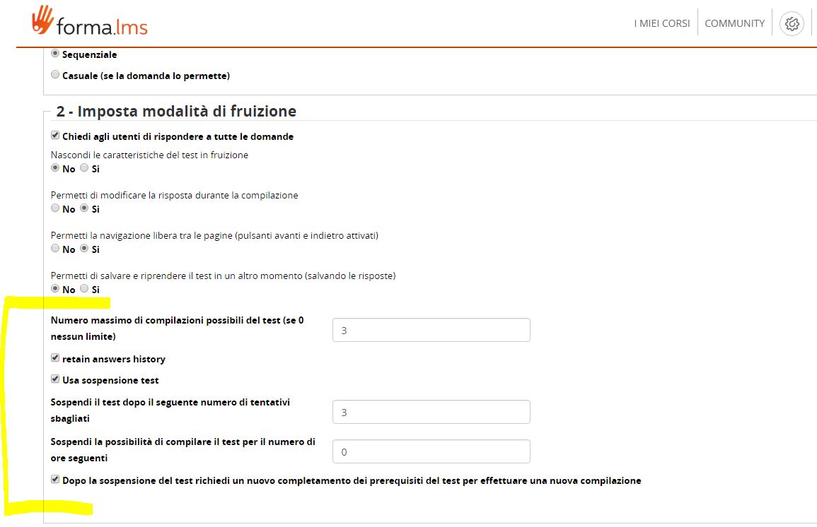 Ho provato la funzione del test "Dopo la sospensione del test richiedi un nuovo completamento dei prerequisiti del test per effettuare una nuova compilazione"