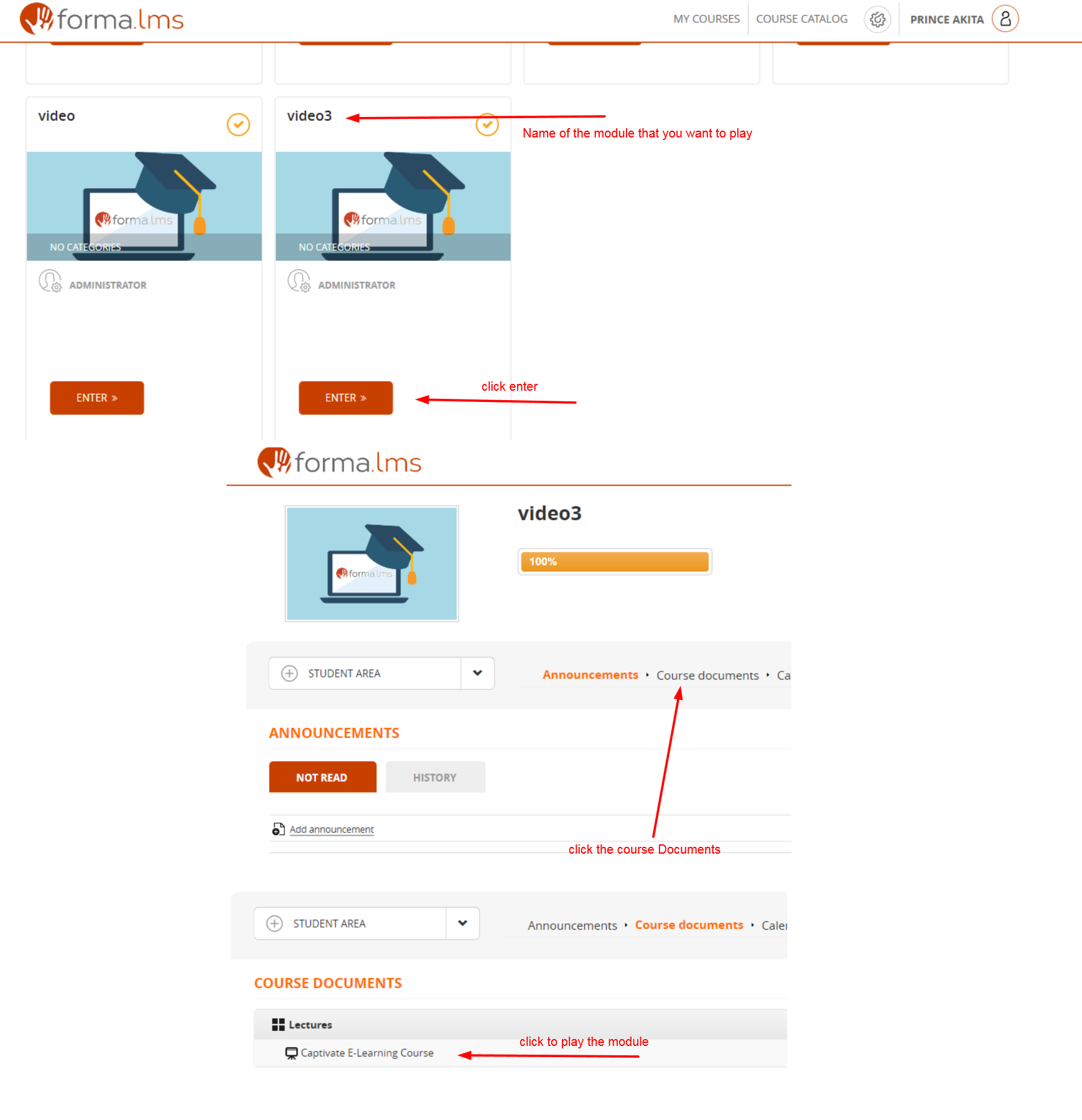 - click on the LO (click on the module you want to play: this is what you meant, right? clicking on the LO....)