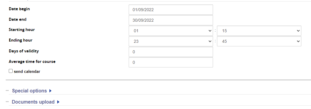 I have Refresher modules, set to start on a set date 1/09/2022 then due to close on 30/09/2022 (see image Back)