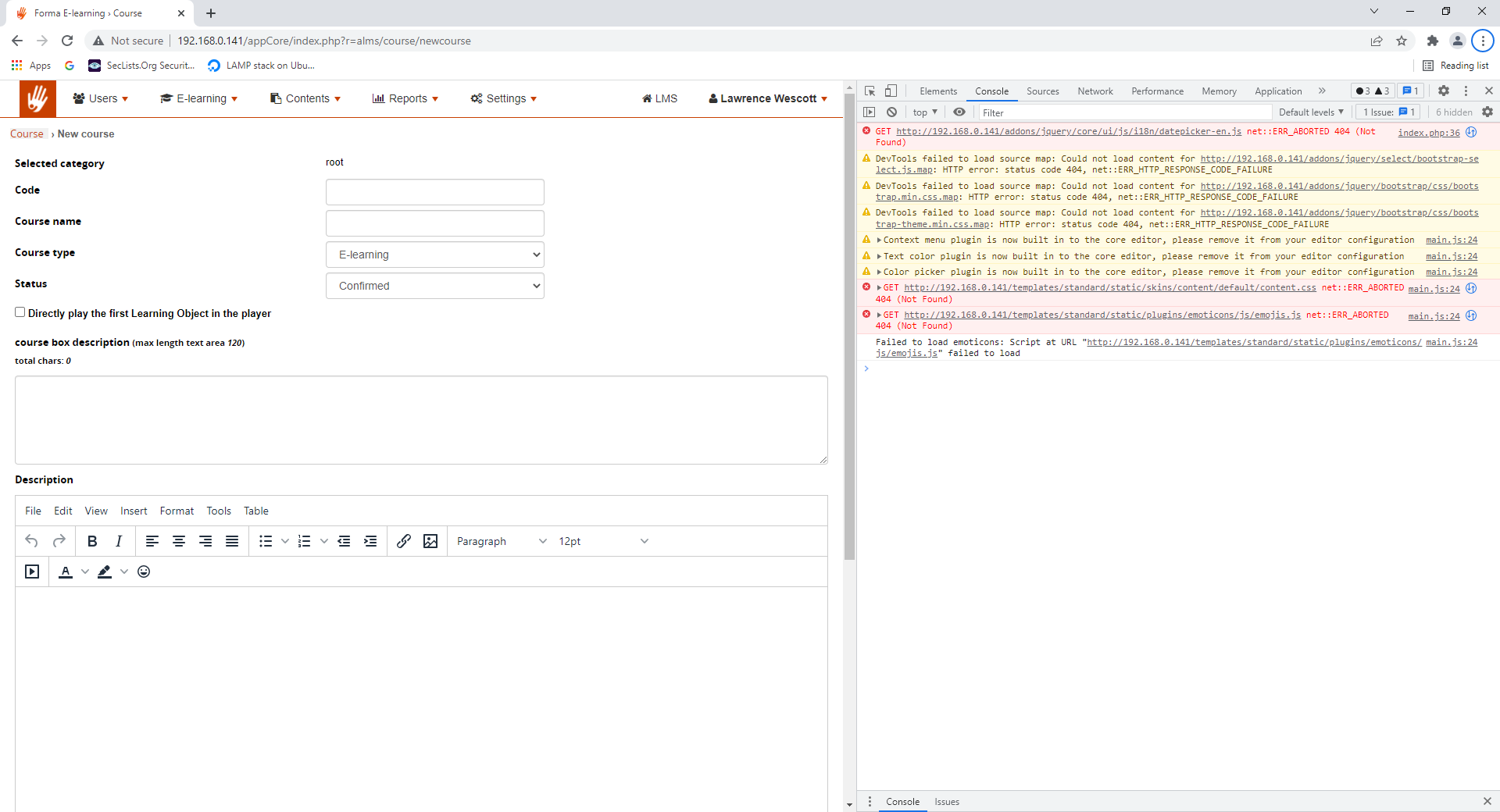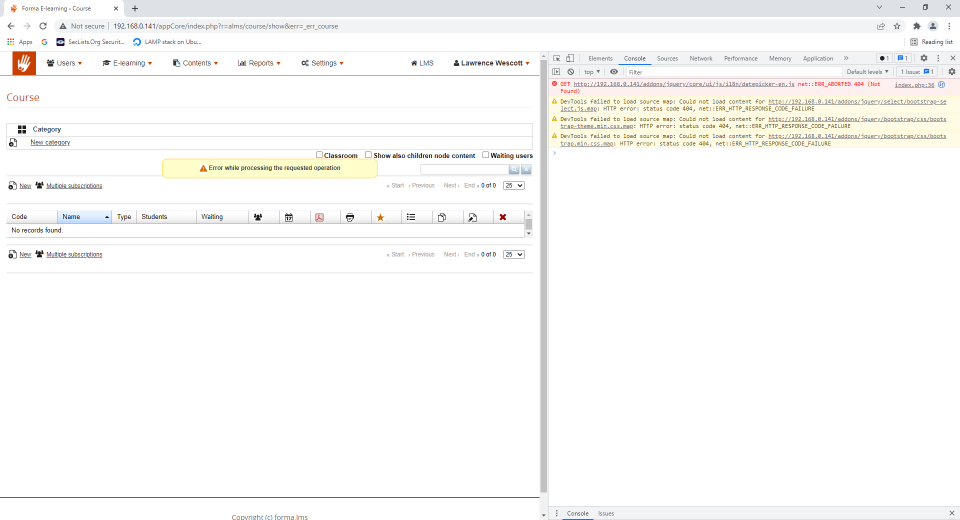 I tried to create a course (just code, course name, course type and status) but the process fails with the message 'Error while processing the requested operation'.