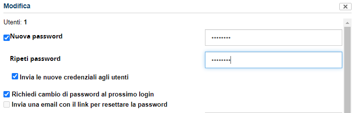 ho aggiornato alla v2.4.5 e mi sono accorto che in "Gestione Utenti" quando vado a selezionare uno o più utenti, poi dal menu a tendina scelgo "Modifica", dalla maschera metto il flag su Nuova Password, Invia le nuove credenziali agli utenti e Richiedi cambio di password al prossimo login e poi clicco "Conferma" il sistema non invia l'e-mail.