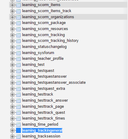 In generale, se nella tabella mysql c'è la parola "track", ci sono dei tracciamenti registrati ad esempio learning.scorm_items_track è il tracciamento degli oggetti scorm