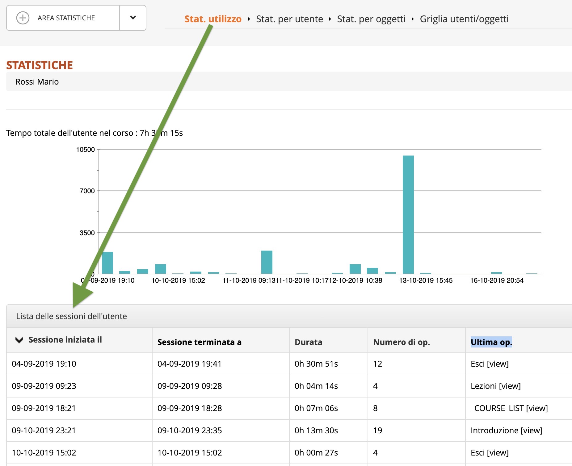 Nell'are AREA STATISTICHE, nelle STAT. UTILIZZO, Lista utenti, Lista delle sessioni dell'utente: Sessione iniziata il, Sessione terminata a,