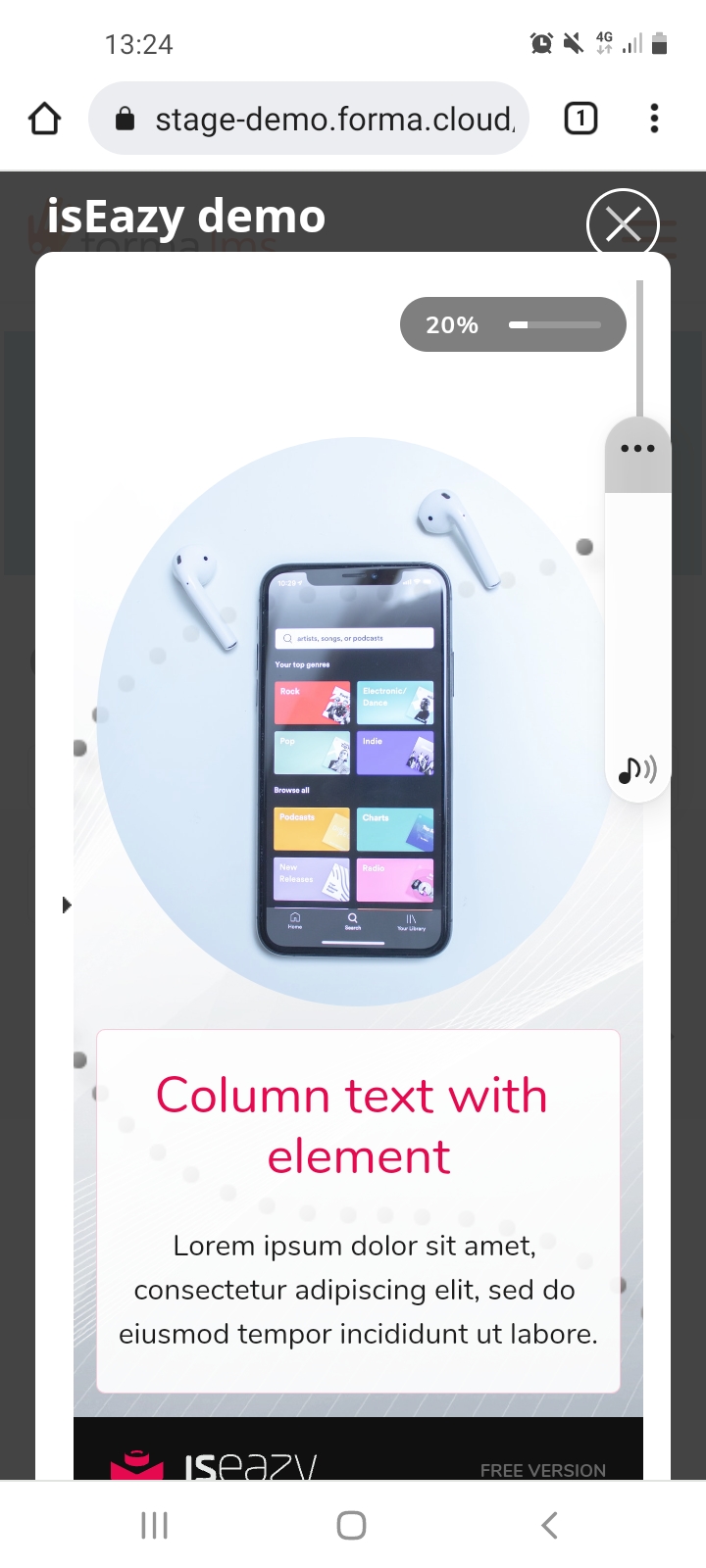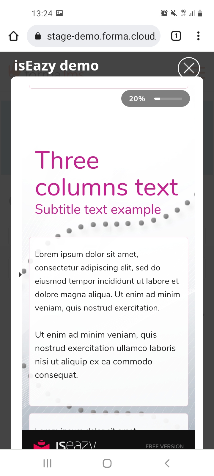 There is however a fair amount of space lost around the sides. Here are screenshots from Cluevo, Moodle and FormaLMS 2.3. Remarkably I have not changed the image size - they are all screenshots from my mobile, a Galaxy Note 10+. Imagine viewing on a smaller screen. I think Cluevo is displaying in a lightbox and it has far larger real estate. It looks great. Moodle is in a new window and while not great, I think is tolerable. FormaLMS is losing a lot of real estate. There are gaps to the left and right and an extra title bar on top which on desktop is fine but on mobile looks clunky. FormaLMS 3 makes the experience less clunky. In fact, it looks quite smooth. However, it makes the screen that much smaller. You lose the black border area, then a further white border area before you actually get to the content. On a mobile device, that is a lot of space.