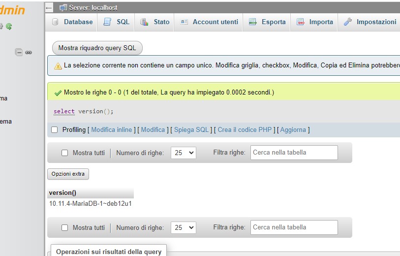 Si prega di eseguirla su un client di sua scelta, ad esempio phpMyAdmin, e di condividere l'output qui nel forum. Questo ci consentirà di fornirle un supporto più preciso. Restiamo in attesa delle sue notizie!