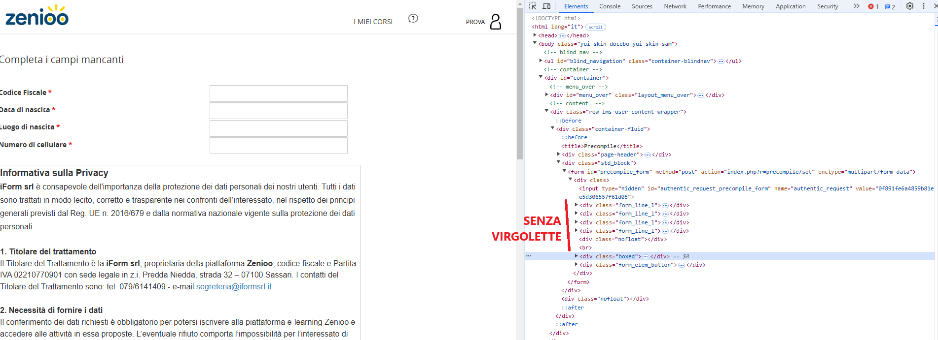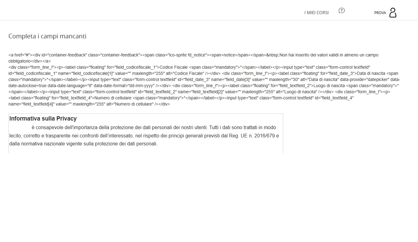 Per i nuovi utenti ci compare un errore che prima non c'era: il modulo "Completa i dati mancanti" viene visualizzato come codice e non come modulo. Allego screenshot.