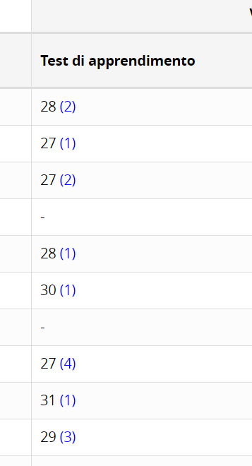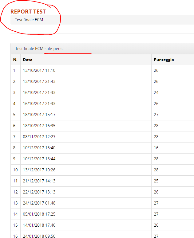 come scritto in precedenza, Il 76 cliccato è di un partecipante (di uno specifico corso), ma l'elenco che compare, rappresenta tutte le compilazione di quell'oggetto (il test finale). Quindi, credo che il docente, possa avere il diritto di vedere le compilazioni effettuate dal particolare partecipante. Il bug descritto, consiste nel non filtrare la visualizzazione per il partecipante cliccato. Viene mostrato un elenco di date e punteggi relative all'oggetto, senza tener conto del partecipante selezionato.
