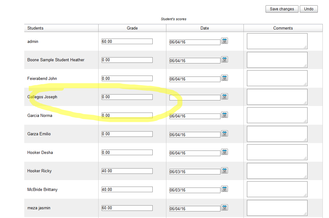 Screen Shot 3 shows that even after calculating the final score as 91 (for user gallegos), as seen in screen shot 2, the final score is not calculated, and actually shows a 0