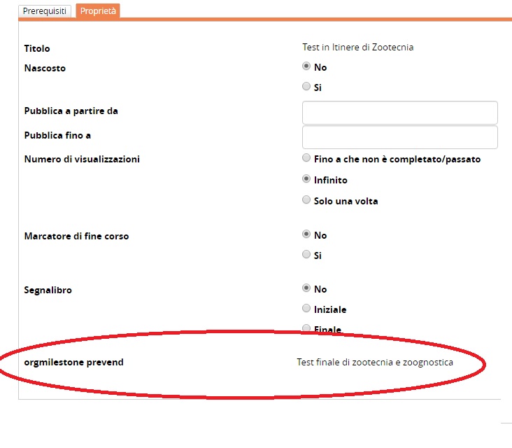 Buongiorno, ho bisogno di un aiuto per una cosa che proprio non capisco. In un test di un corso e solo in quello appare nelle proprietà una voce che non riesco a capiree che non ho chiaro a cosa serva e da dove si comanda, il label mi dice "orgmilestone prevend". Ho allegato immagine in modo che sia più chiaro cosa vedo.