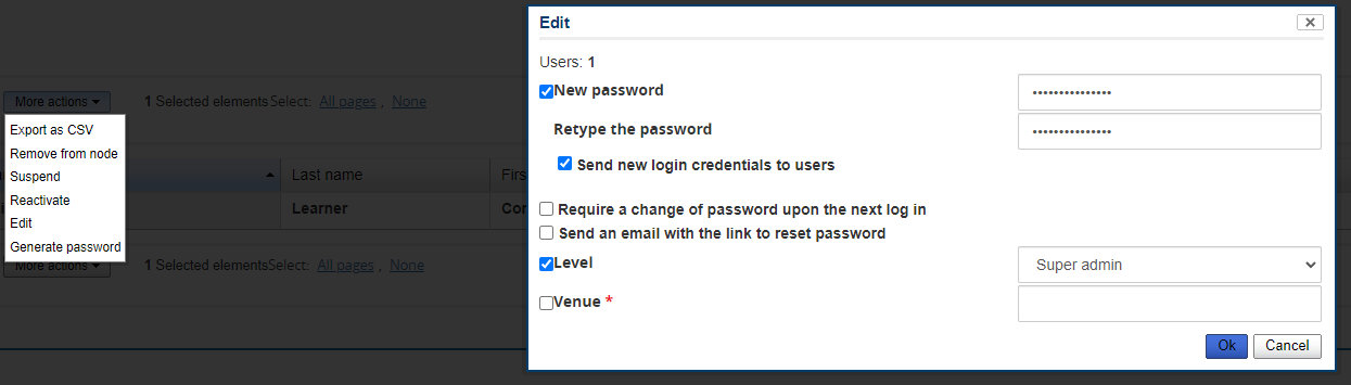 Admin changing User level via More Actions button
