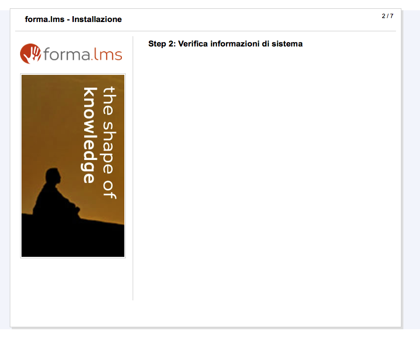 Buonasera. Dopo aver installato numerose volte in passato Forma LMS, oggi ho riscontrato per la prima volta un problema sul quale chiedo aiuto. La procedura di installazione parte regolarmente, tuttavia al secondo passaggio (Step 2: Verifica informazioni di sistema) mi compare una pagina completamente vuota.