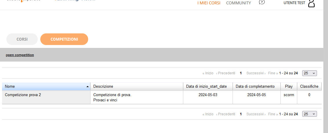 1) ho impostato una competizione e caricato uno SCORM (6 slide: slide iniziale, 3 quiz V/F, slide risultati, slide finale create con Storyline e punteggio in %). La competizione ha una durata di 3 giorni e al momento sono nella finestra di attivazione